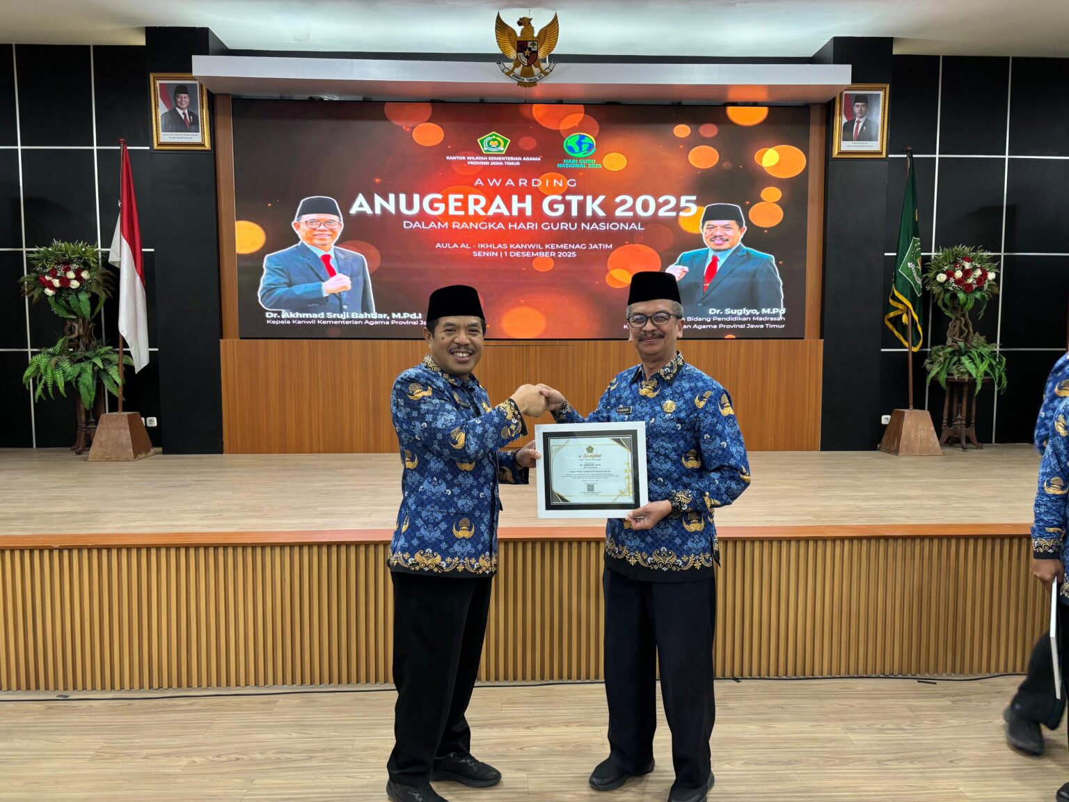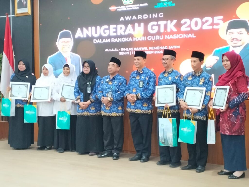Penghargaan tersebut diserahkan oleh Kepala Bidang Pendidikan Madrasah Kanwil Kementerian Agama Jawa Timur, Dr. H. Sugiyo, M.Pd., bertepatan dengan peringatan Hari Guru Nasional 2025, Senin (1/12/2025), di Aula Al-Ikhlas Kanwil Kemenag Jawa Timur. Penghargaan ini tercatat dalam e-Sertifikat Nomor 993/Kw.13.02/11/2025.