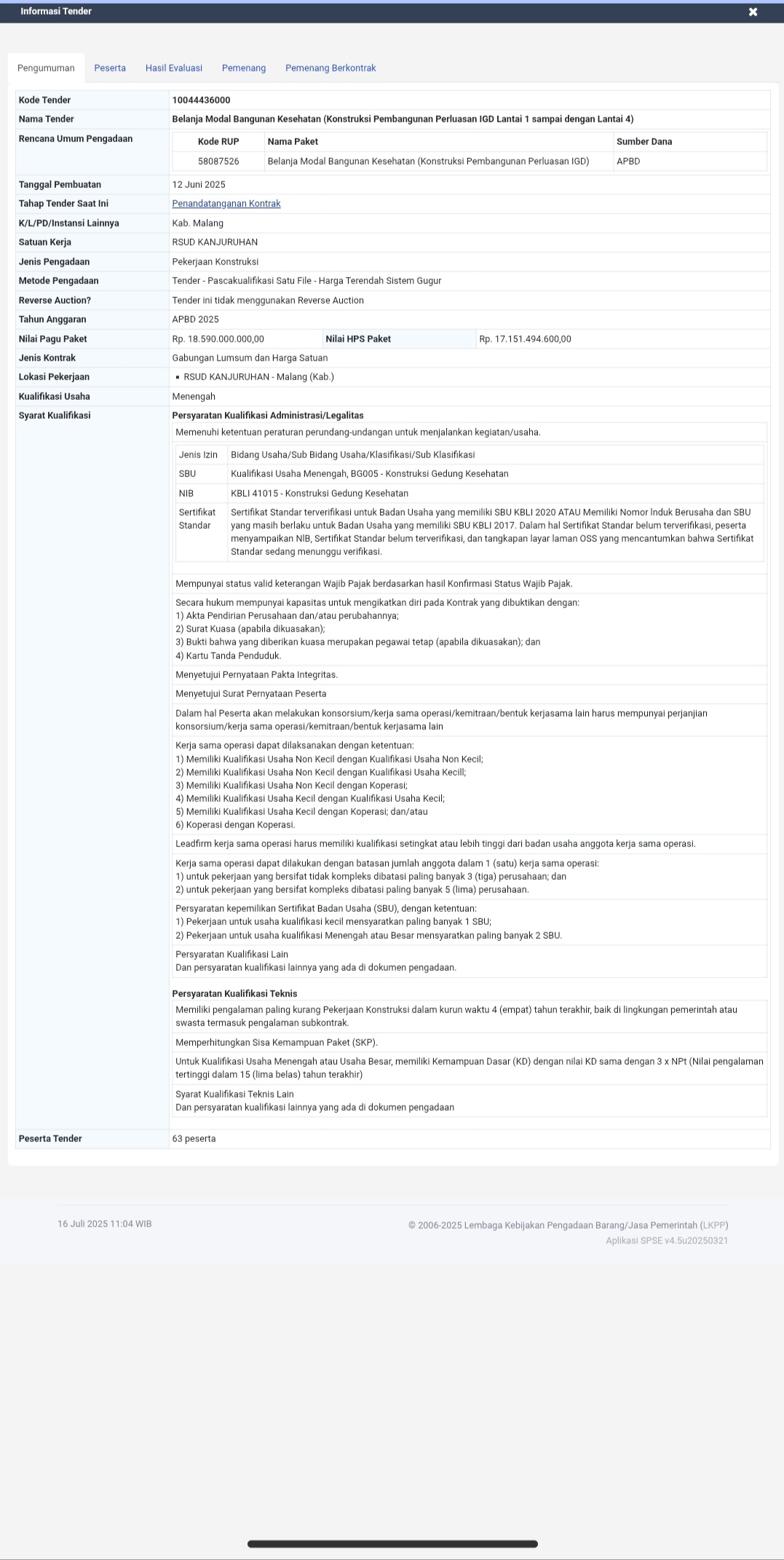 Proses tender proyek Perluasan IGD RSUD Kanjuruhan lantai 1-4 ,dengan kode tender 10044436000 memasuki babak baru. Meski dalam sistem LPSE Kabupaten Malang sudah tercatat masuk ke tahap Penandatanganan Kontrak per 16 Juli 2025, namun hingga kini belum ada kejelasan final dari pihak Pokja.